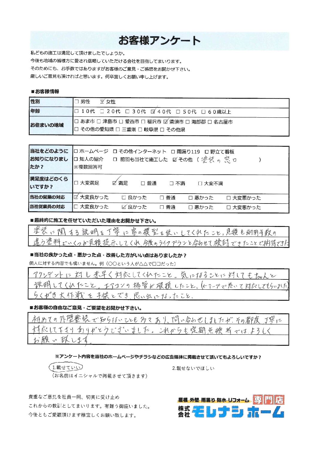 初めての外壁塗装で知らないことも多々あり、問い合わせをしましたが、その都度丁寧に対応して下さりありがとうございました。これからも定期点検等ではよろしくお願い致します。 -