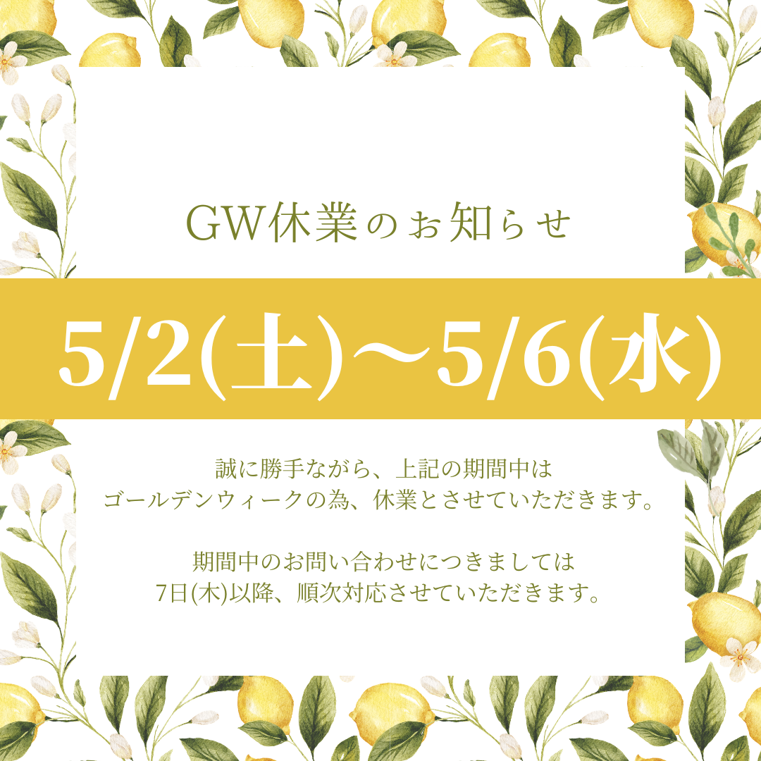 2026年 GW休業のお知らせ 平素より、格別のお引き立てを賜り、厚く御礼申し上げます。 ゴールデンウィーク休業のお知らせです。 2026年5月2日(土)から2026年5月6日(水)まで休業とさせていただきます。 休業中のお問い合わせにつきましては、休業期間明けより順次ご対応させていただきます。 2026年5月7日(木)より通常営業いたします。 何卒よろしくお願い申し上げます。
